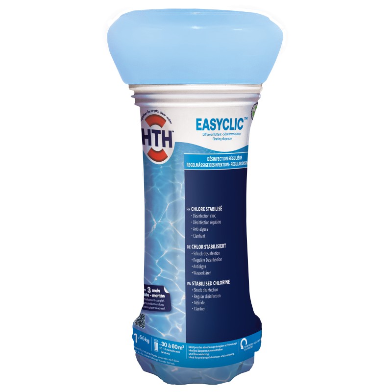 DÉSINFECTION CHOC • DÉSINFECTION RÉGULIÈRE • ANTI-ALGUES • CLARIFIANT Caractéristiques • Diffuseur flottant autonome, très simple d’utilisation. • Dissolution totale sans résidu. • Teneur élevée en matière active. • Actions désinfectantes choc et longue durée. • Action algicide. • Action clarifiante. • Action oxydante. • Ne contient pas de cuivre. • Non-comburant au transport, au stockage et à la manipulation. • Stabilisation élevée contre l’action destructrice des rayons ultra-violets de la lumière solaire. • Convient pour toutes les eaux, même très dures. • Compatible avec tout équipement de filtration. Composition Contient du symclosène (> 720 g/kg) et du troclosène sodique dihydrate (> 100 g/kg) Mode d’emploi Ajuster le pH entre 7,0 et 7,4. Par la suite, effectuer cette opération au moins une fois par semaine. Retirer l’étiquette plastifiée en découpant suivant les pointillés, à l’endroit indiqué par la flèche rose (Conserver l’étiquette afin de pouvoir s’y reporter si nécessaire.) Tourner la partie bleue du diffuseur flottant afin de sélectionner la taille d’ouverture correspondant au volume de la piscine : • Taille n°1 (trous les plus petits) pour une piscine de 30 à 40 m³ jusqu’à 3 mois de traitement • Taille n°2 (trous intermédiaires) pour une piscine de 40 à 50 m³ jusqu’à 2 mois de traitement • Taille n°3 (trous les plus grands) pour une piscine de 50 à 60 m³ jusqu’à 1 mois de traitement • Placer le diffuseur flottant directement dans le bassin, en l’absence de baigneurs.En cas de conditions extrêmes (orages, forte affluence de baigneurs…), effectuer une chloration-choc. Il est possible de traiter une piscine présentant un volume compris entre 60 m³ et 120 m³. Pour cela, utiliser deux flotteurs et régler leur taille d’ouverture sur le volume correspondant à la moitié du volume total du bassin. Le flotteur bascule sur le flanc lorsqu’il est vide ; utiliser alors un nouveau flotteur pour continuer le traitement.